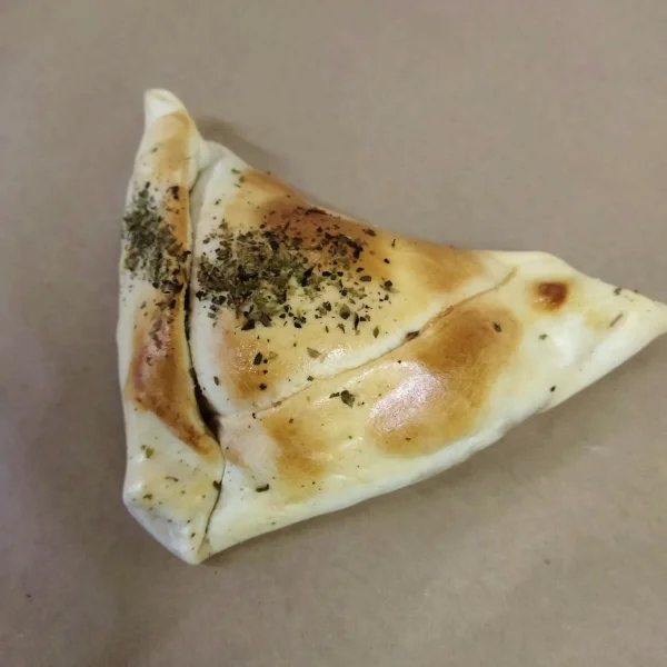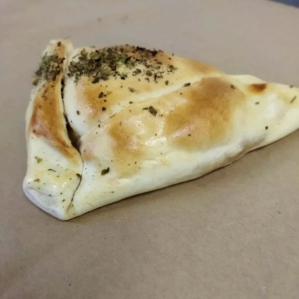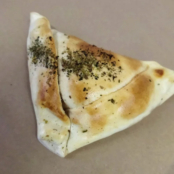 Empanada Napolitana rellena de tomate, queso, aceituna y orégano.