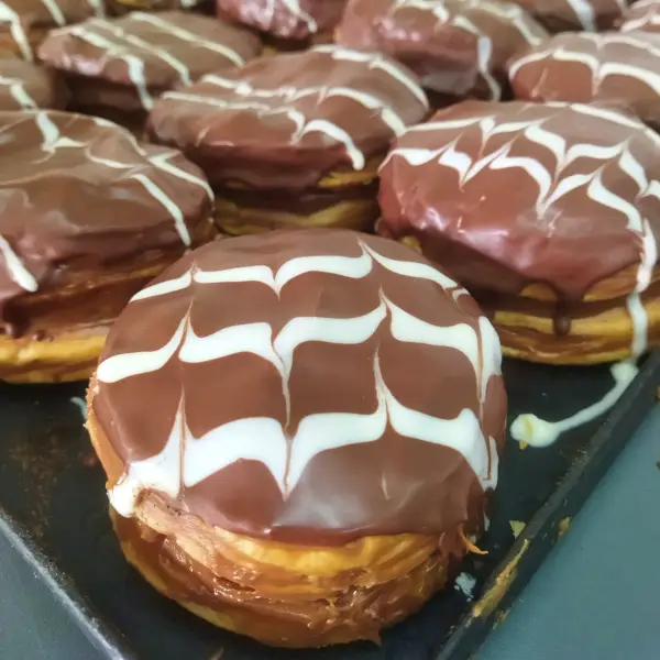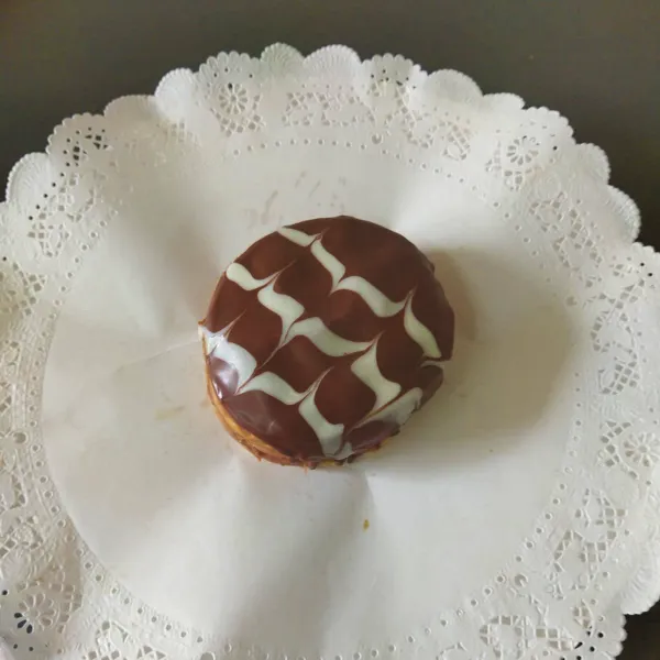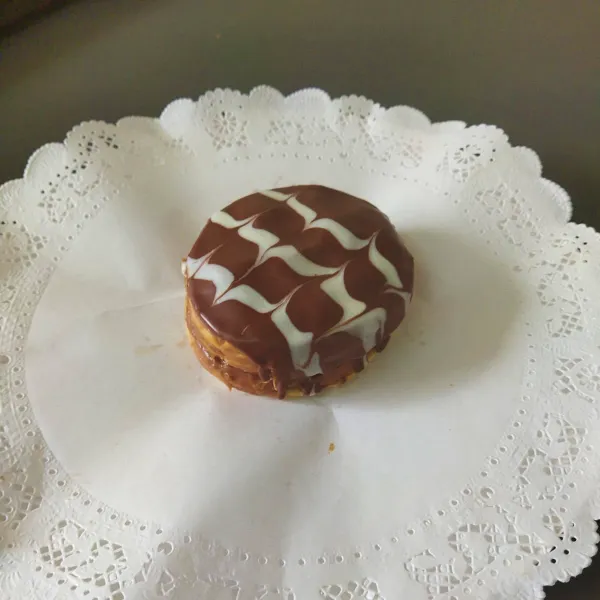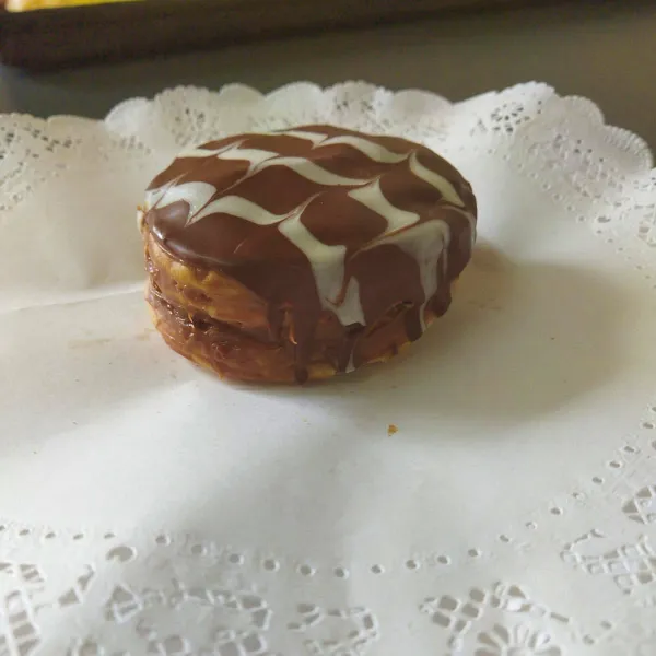 Torta de Hoja rellena con manjar bañado en chocolate y un toque de chocolate blanco.